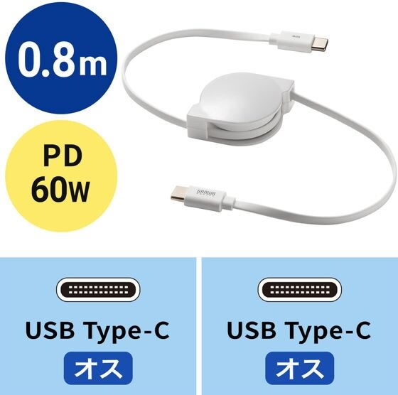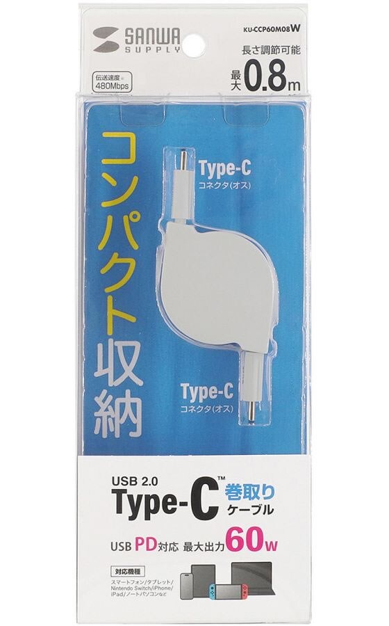 【お取り寄せ】 サンワサプライ USB2.0 Type-C 巻取りケーブル KU-CCP60M08W USBケーブル C to ケーブル 電源タップ 配線パーツ 家電