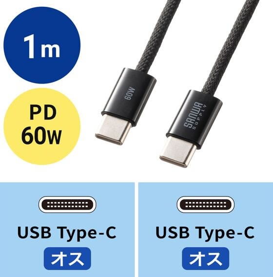 USB Type-Cポートを持つパソコンやタブレット端末などと、USB機器(Type-Cポートを持つ機種)を接続するためのケーブルです。シリコンメッシュ素材を採用しているため、手触りが良く、滑りにくいケーブルです。シリコンメッシュは柔軟性にも優れているため、折り曲げやすく、断線しにくいです。PD60Wの高速充電に対応しており、Nintendo Switchなどのゲーム機の充電にも対応しています。