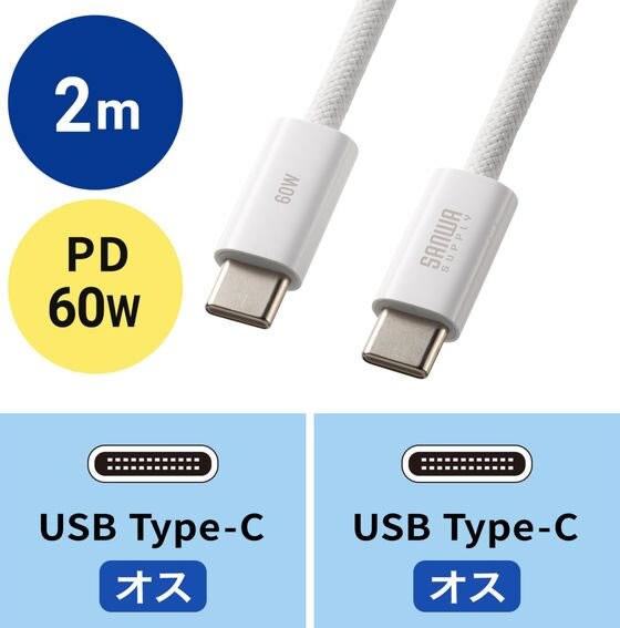 USB Type-Cポートを持つパソコンやタブレット端末などと、USB機器(Type-Cポートを持つ機種)を接続するためのケーブルです。シリコンメッシュ素材を採用しているため、手触りが良く、滑りにくいケーブルです。シリコンメッシュは柔軟性にも優れているため、折り曲げやすく、断線しにくいです。PD60Wの高速充電に対応しており、Nintendo Switchなどのゲーム機の充電にも対応しています。