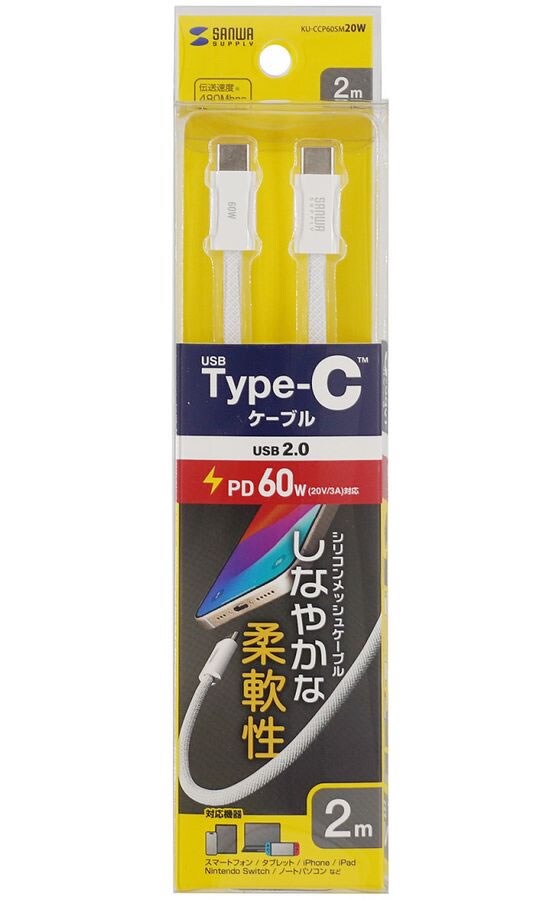 【お取り寄せ】 サンワサプライ USB Type-Cシリコンメッシュケーブル 2m KU-CCP60SM20W USBケーブル C to ケーブル 電源タップ 配線パーツ 家電