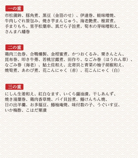 ●アレルゲン:乳・小麦・卵・エビ・カニ・くるみ・あわび・いか・いくら・牛肉・さけ・さば・大豆・鶏肉・豚肉・もも・やまいも・りんご・ごま