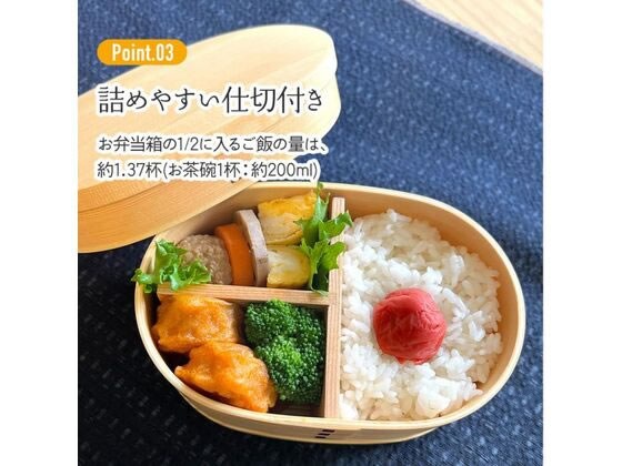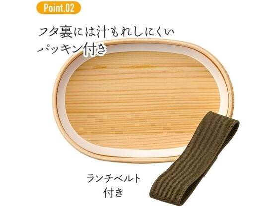 お弁当箱の1/2に入るご飯の量は約2杯(お茶碗1杯:約200mL)。詰めやすい仕切付き。フタ裏には汁もれしにくいパッキン付き。手入れが楽なウレタン塗装。ランチベルト付き。