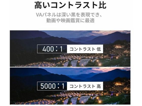 高いコントラスト比:5000:1の高いコントラスト比を実現したVAパネルは深い黒を表現でき、動画や映画鑑賞に最適です。上下左右178°の広視野角。ナローベゼル:薄いベゼル(ディスプレイの外枠部分)でシームレスなデザインを実現し、より没入感のある映像体験をお届けします。HDMI x 3とUSBメモリーに保存した動画を直接再生可能なメディアプレイヤーを搭載。