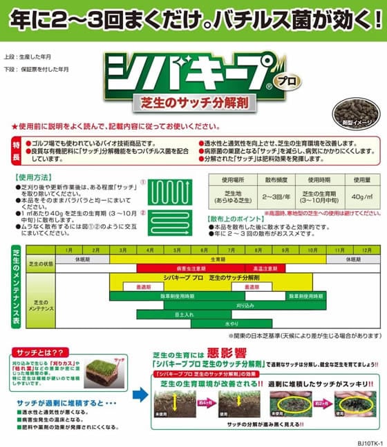 パラパラ撒くだけで病原菌の巣窟となる「サッチ」を分解し、病気にかかりにくくします。サッチが分解されると透水性と通気性が向上して、芝生の育成環境が改善されます。良質な有機肥料に納豆菌の仲間であるバチルス菌を配合した、安全性の高い商品です。日本芝にも西洋芝にも使える芝生メンテナンスの必需品です。