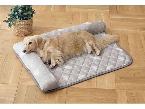 表生地に接触冷感生地を使用しペットの暑さ対策に最適。中綿入りのL字枕付きで、あごを乗せたり体ごともたれてくつろげます。裏面は滑りにくい加工で安心です