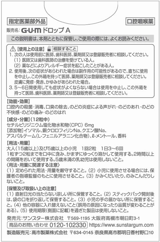 ●効能・効果:口腔内の殺菌・消毒、口臭の除去、のどの炎症による声がれ・のどのあれ・のどの不快感・のどの痛み・のどのはれ