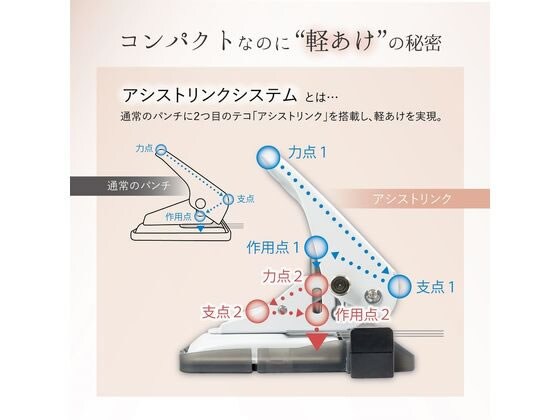 二重テコ搭載の軽あけパンチ「アリシス」。コンパクトサイズでの軽あけを実現。