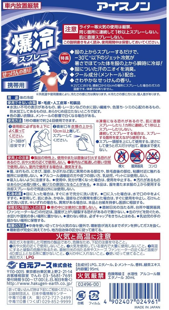 白元アース アイスノン 爆冷スプレー せっけん 携帯用 95mL 冷却 温熱 メディカル