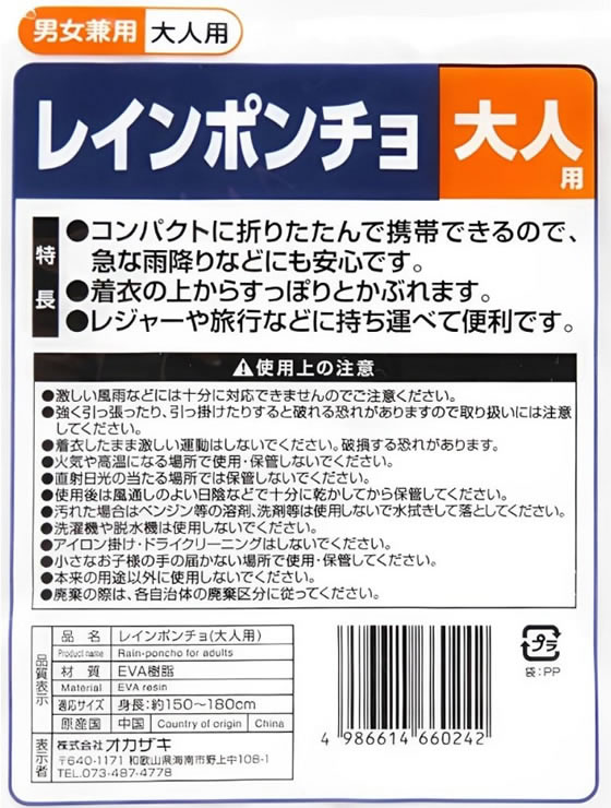 【お取り寄せ】 オカザキ レインポンチョ 大人用 合羽 レインウエア 雨具 防水関連 日用雑貨