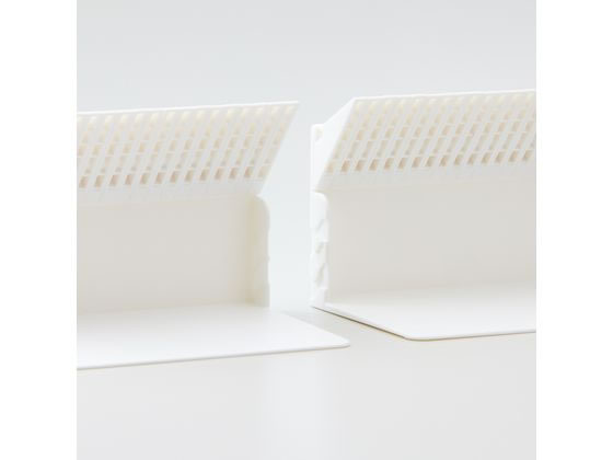 本以外にCD・DVDなどの整理にも。ストッパーが本をしっかり支え、抜き取っても隣の本が倒れない。両サイドのジョイントで連結可能。本などを手前側から差し込むとストッパーが上がり、両サイドのストッパーが差し込んだものを保持するので倒れません。数冊のうち1冊だけ抜き取っても抜き取ったところのストッパーだけが下がり、隣の本が倒れないので、戻す場所が分かりやすい。うら面には滑り止めの足ゴム付き。