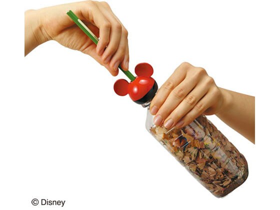 空のペットボトルに取り付けるだけで鉛筆削りに!飲み終わったペットボトルに取り付けて使う、ミッキーマウスの形のかわいい鉛筆削り。削りくずをペットボトルにためて一度に捨てられるので、部屋を汚す不安が軽減できます。500mlのペットボトルを使用した場合、鉛筆約10本分の削りくずをためることができます。ケズリキャップ専用ボトル(別売)にも取り付け可能です。
