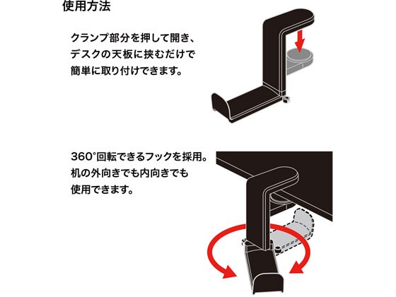 デスクや棚にワンタッチで簡単に設置できるヘッドホンフックです。360度回転式なので机の外向きでも内向きでも使用できます。最大38mmまでの天板にしっかり固定できるバネ式構造を採用しています。ヘッドバンドを傷付けないレザー調のソフトクッション付きです。