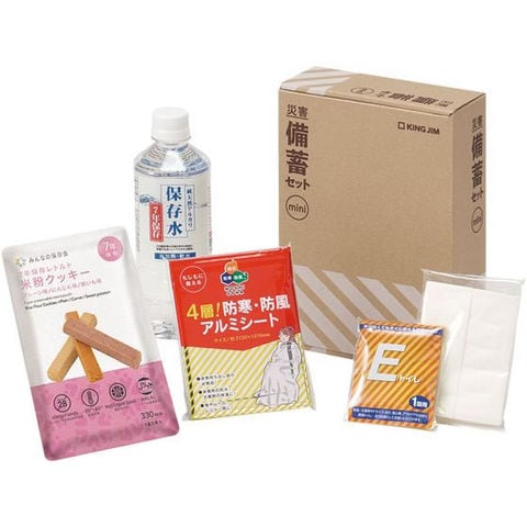 キングジムの災害備蓄セットミニは、災害発生当時必要最低限のものをコンパクトにまとめたセットです。水や米粉クッキー、アルミブランケットなどがA5サイズの箱に入っています。一人分の災害備蓄品がまとまっている為、管理がしやすく商業施設など不特定多数の人が集まる場での災害発生時に素早く配布することが可能です。背表紙は日本語と英語を採用したリバーシブルデザインで、海外の方にも防災用品であることが伝わります。