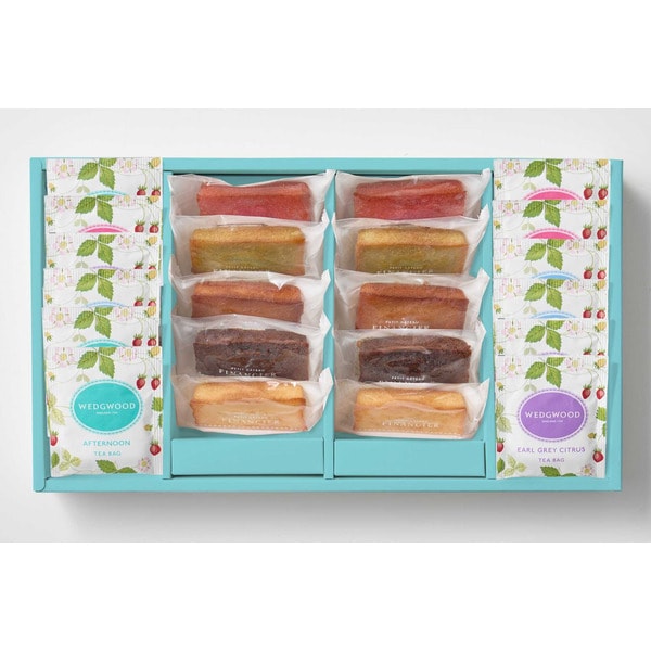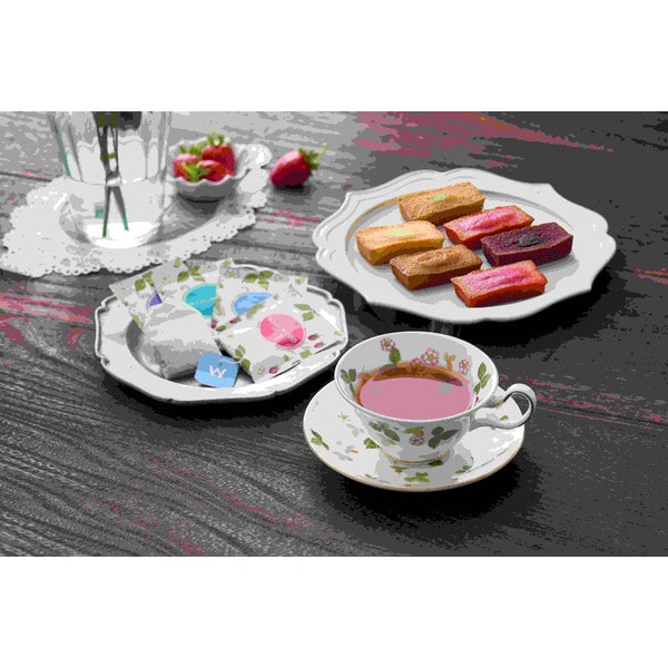 フィナンシェ(ストロベリー・ピスタチオ・チョコ・プレーン・イチジク×各2個)、ワイルド ストロベリーティーバッグ(ブレックファスト、アフタヌーン、ストロベリー、アールグレイシトラス×各3袋)※フィナンシェはウェッジウッドの商品ではありません。