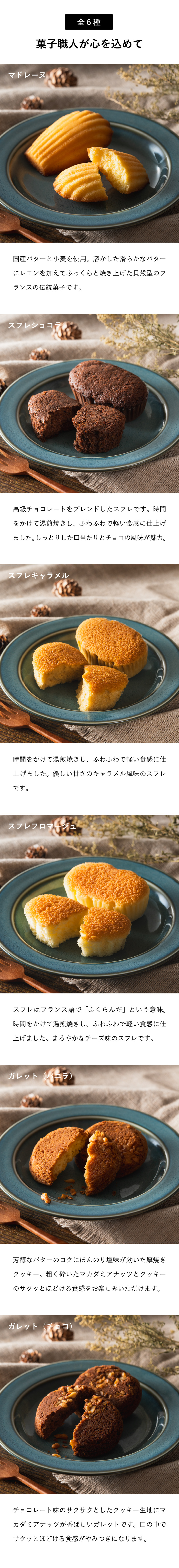 ●内容量:マドレーヌ・スフレショコラ・スフレキャラメル・スフレフロマージュ・ガレット(バニラ)・ガレット(チョコ)×各1個