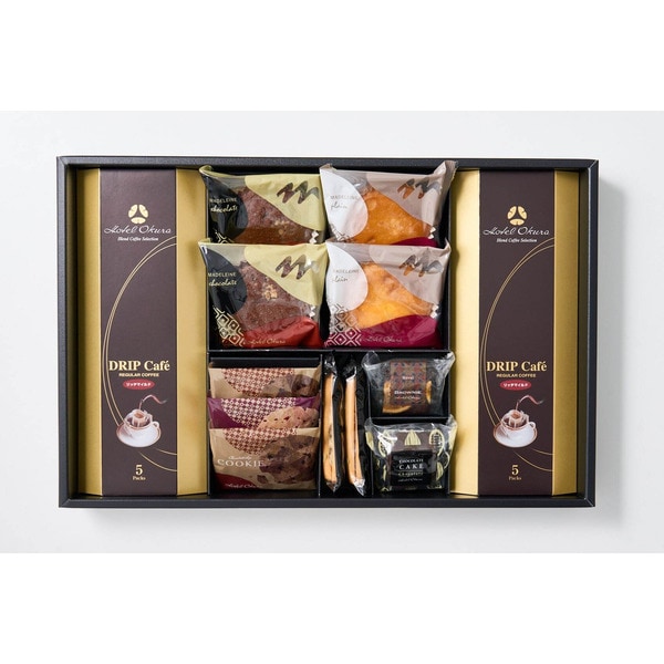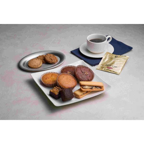 レーズンサンド・マドレーヌ(プレーン・チョコ)・ドリップ珈琲リッチマイルド40g(8g×5袋)・チョコチップクッキー×各2個、ブラウニーネーブル・チョコレートケーキ・レーズンクッキー×各1個