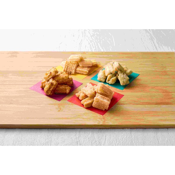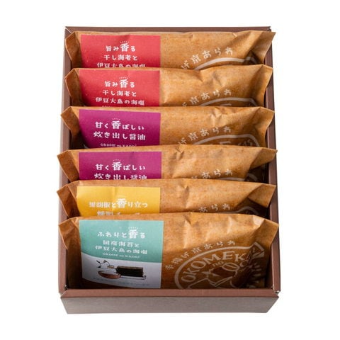 手揚げ京あられ×6袋(旨み香る干し海老と伊豆大島の海塩14g・甘く香ばしい炊き出し醤油15g×各2袋、ふわりと香る国産海苔と伊豆大島の海塩15g・黒胡椒と香り立つ燻製チーズ12g×各1袋)