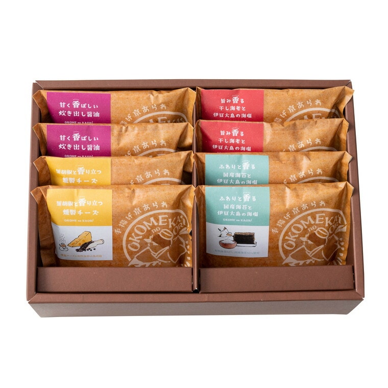 手揚げ京あられ×8袋(旨み香る干し海老と伊豆大島の海塩14g・甘く香ばしい炊き出し醤油15g・ふわりと香る国産海苔と伊豆大島の海塩15g・黒胡椒と香り立つ燻製チーズ12g×各2袋)