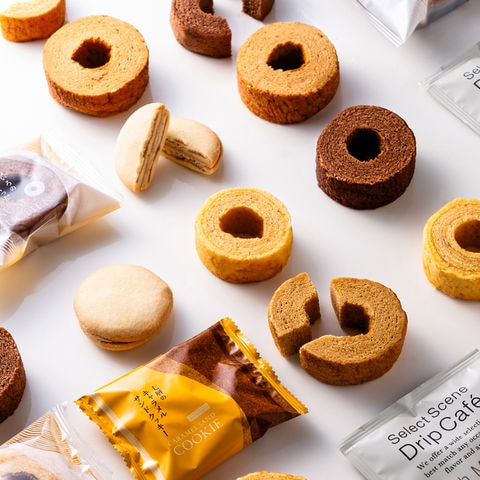 ●内容量:ふんわりバームクーヘン(ミルク・ココア×各1個、黒糖×2個)、七層のキャラメルサンドクッキー×2個、三喜屋珈琲のレギュラーコーヒー×2袋