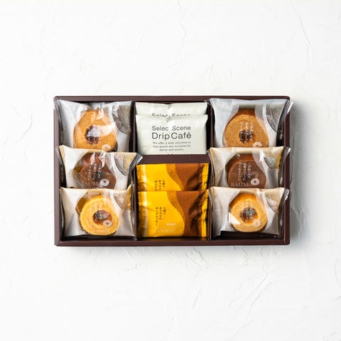 ●内容量:ふんわりバームクーヘン(ミルク・ココア・黒糖×各2個)七層のキャラメルサンドクッキー×2個、三喜屋珈琲のレギュラーコーヒー×2袋