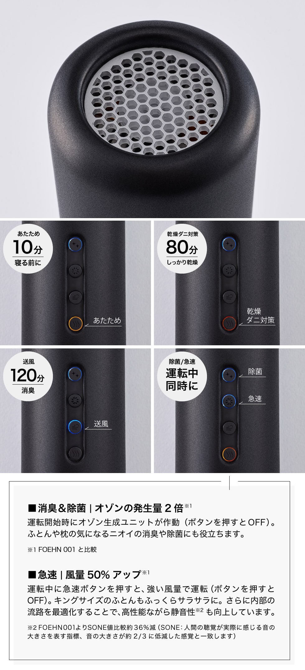 ふとん乾燥機といえばノズル式という常識を覆すスティック型。従来のFOEHN001から風量を約50%アップさせた急速モードで、キングサイズの布団もふかふかに。あたため・乾燥ダニ対策・消臭の3つのモードに加え、除菌&急速機能も搭載。寒い冬だけでなく、梅雨や花粉の季節などオールシーズン活躍します。