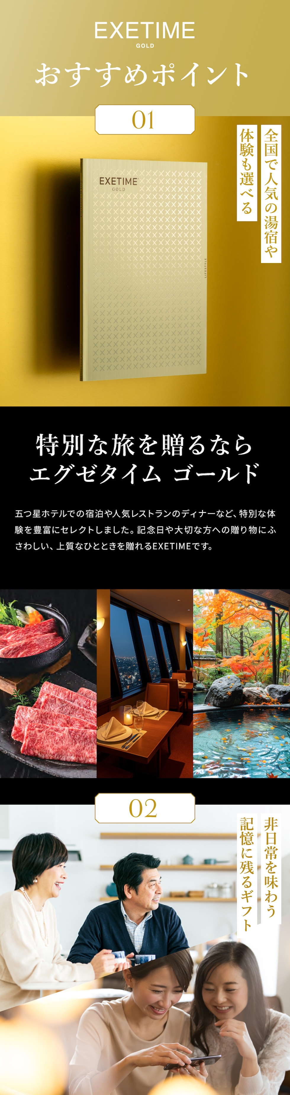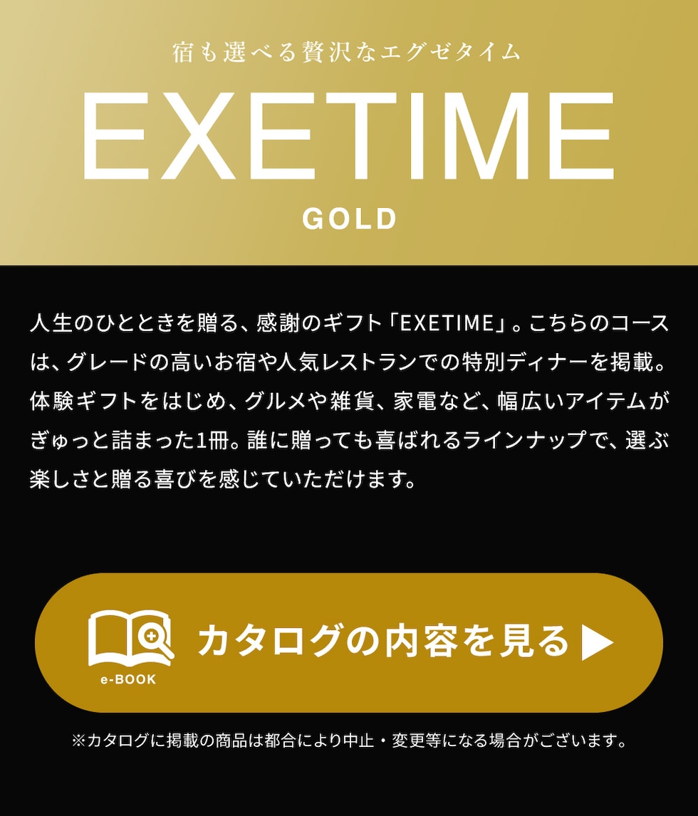 カタログギフト EXETIME(エグゼタイム) GOLD 送料無料 旅行 旅行券 体験版 ギフト お祝い お返し 内祝い 返礼品 引出物 結婚内祝い 記念品 ギフトカタログ 写真入り メッセージカード無料 名入れ 贈答品 プレゼント gws お歳暮