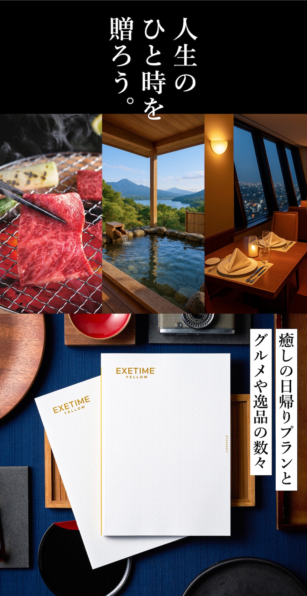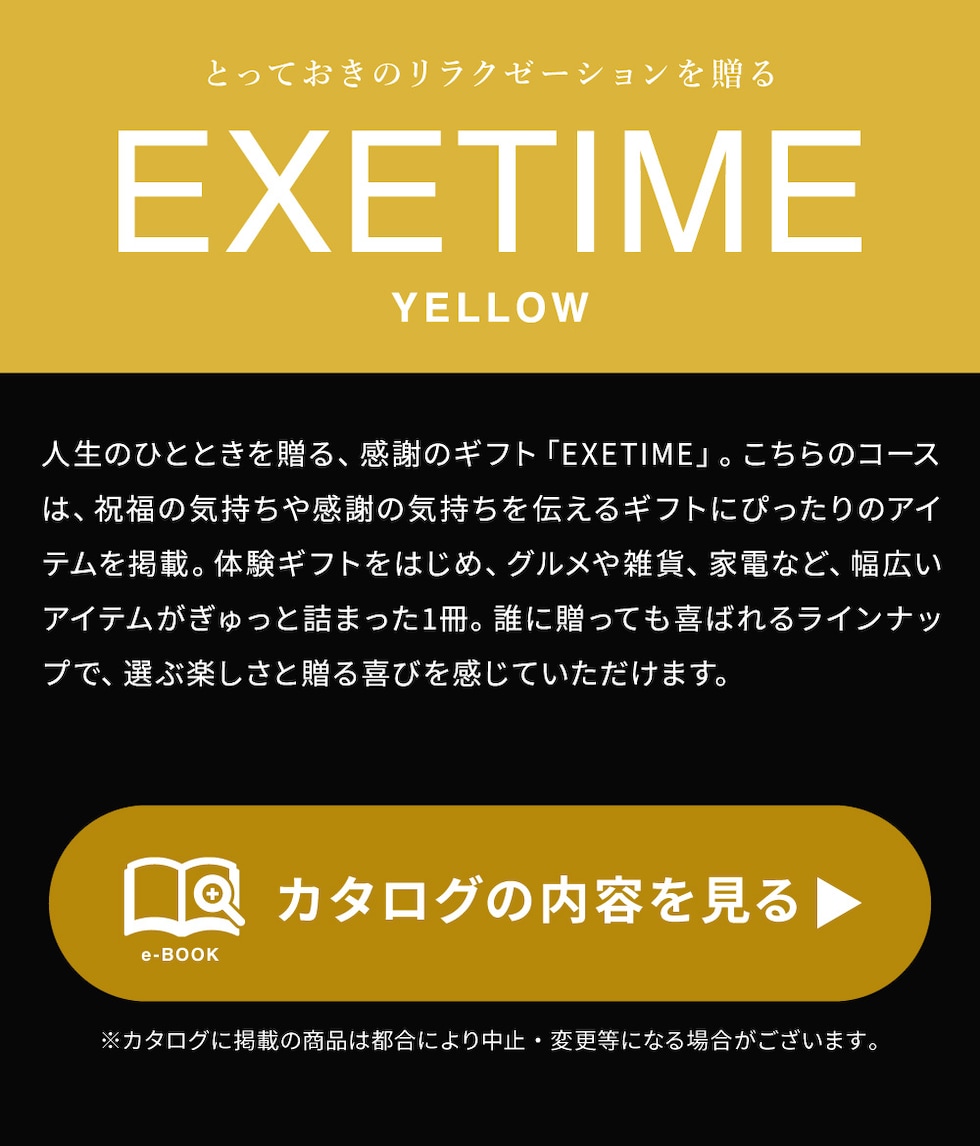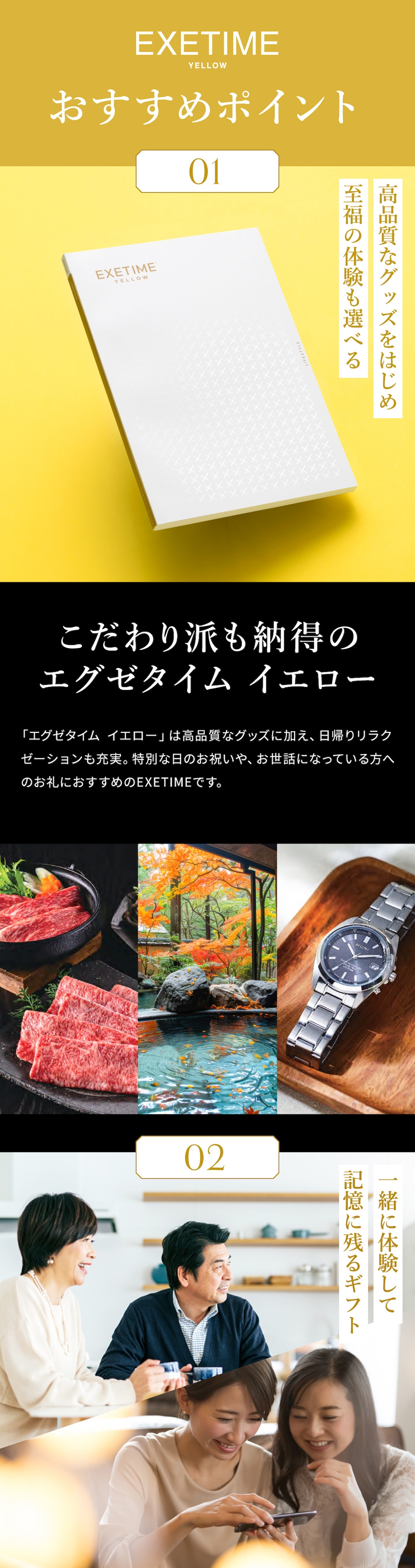 カタログギフト EXETIME(エグゼタイム) YELLOW 送料無料 旅行 旅行券 体験版 ギフト お祝い お返し 内祝い 返礼品 引出物 結婚内祝い 記念品 ギフトカタログ 写真入り メッセージカード無料 名入れ 贈答品 プレゼント gws お歳暮