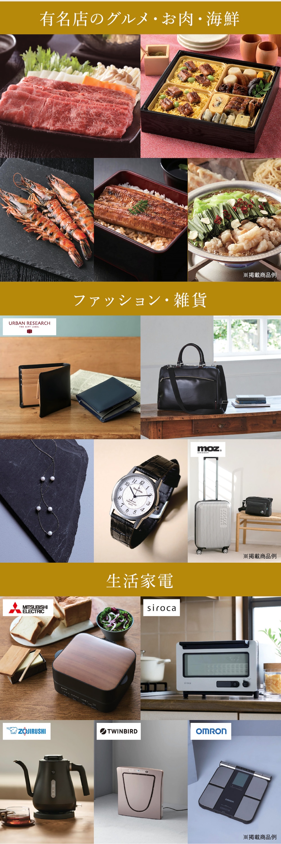 有名ブランドのアイテムをはじめ、名店のグルメや上質なお肉、洗練されたインテリアなど、厳選された商品を多数掲載。ワンランク上の贈り物を求める方にふさわしい特別なカタログギフトです。ゴールドに輝く高級感あふれるギフトボックスに入れてお届けします。