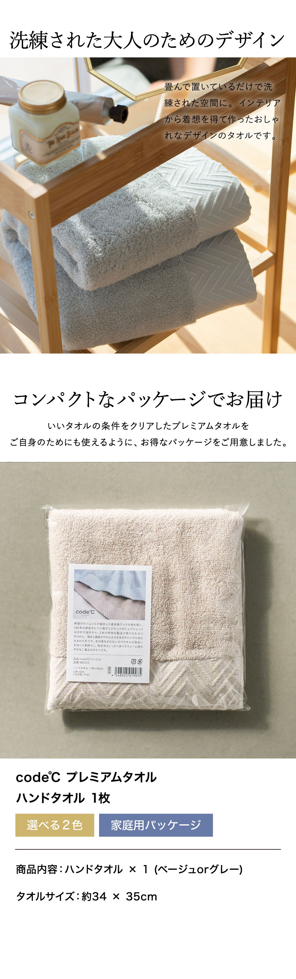 code℃ コードシー プレミアムタオル ハンドタオル 1枚 選べる2色 ベージュ グレー のし・包装・メッセージカード不可 / 自宅用 家庭用 今治タオル 日本製 日本製タオル 綿100% コットン JGS / ベージュ