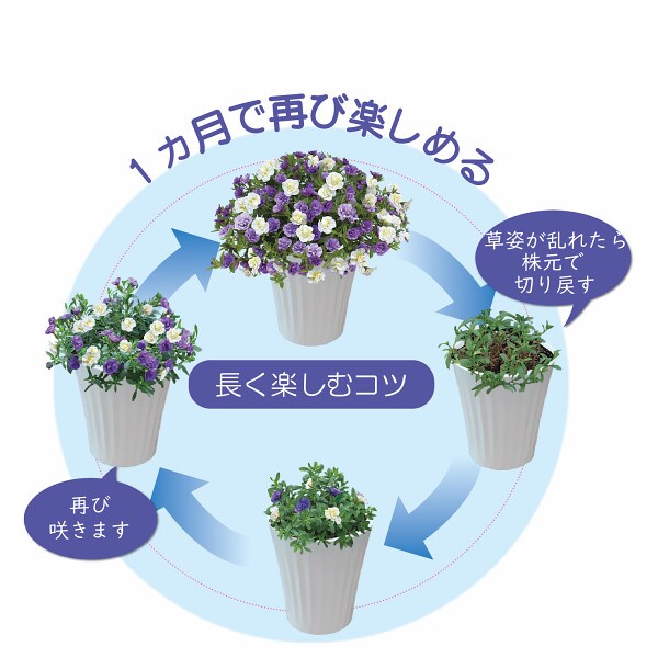 すっきりとした青と白のコントラストが美しいスーパーベルです。ガーデニングが好きなお母様にぴったりの長く楽しめる贈り物。切り戻して繰り返し咲くのも魅力です。