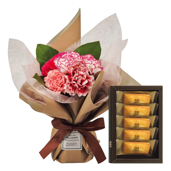 ●商品内容:カーネーション5、レモンリーフ、お手入れのしおり付、フィナンシェ×5