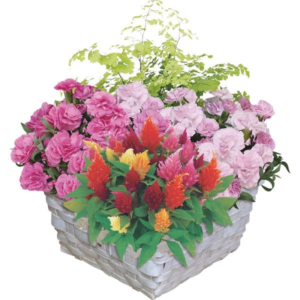 ●ミニカーネーション「プリティーローズ」3号(ピンク系)×2、アジアンタム3号×1、ケイトウ3号×1、バスケット