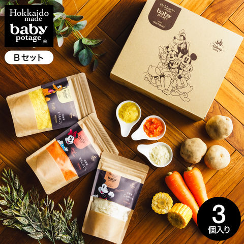 Disney ディズニー Baby Potage 北海道産無添加ベビーフード Disneyデザインのギフトボックス入り クラフト袋(80g) 3個セット ギフト サービス / にんじん かぼちゃ じゃがいも とうもころし 無添加 贈り物 出産祝い 離乳食 ベビーギフト 野菜フレーク / B
