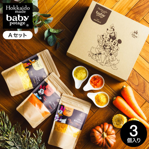 Disney ディズニー Baby Potage 北海道産無添加ベビーフード Disneyデザインのギフトボックス入り クラフト袋(80g) 3個セット ギフト サービス / にんじん かぼちゃ じゃがいも とうもころし 無添加 贈り物 出産祝い 離乳食 ベビーギフト 野菜フレーク / A