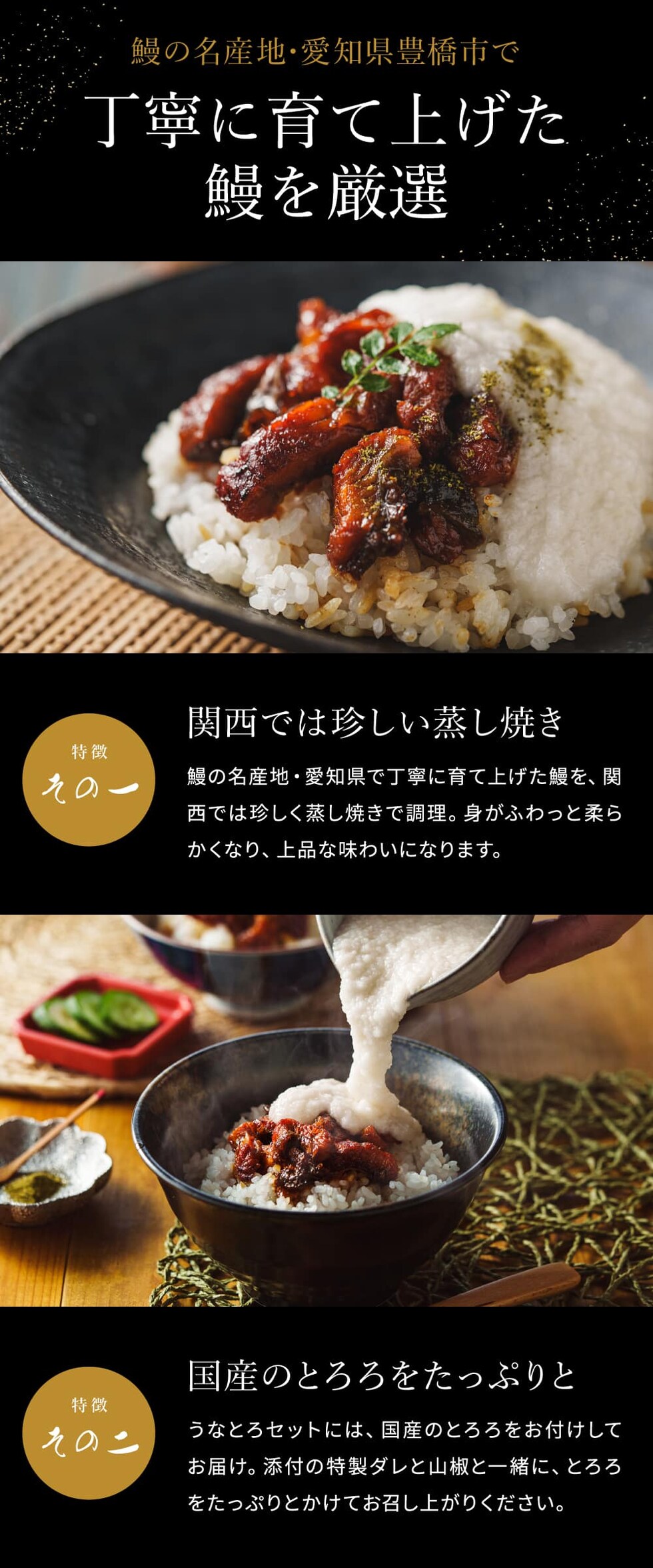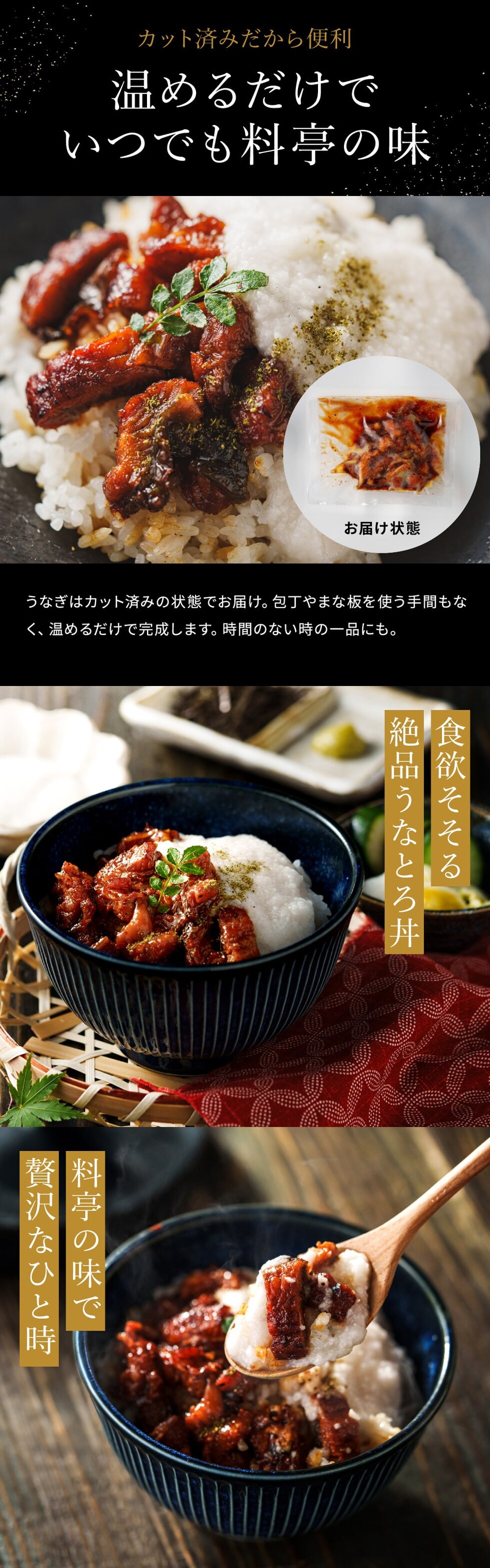 ●内容量:うなぎ蒲焼50g(国産・刻み) 50g×3、とろろ50g×3、たれ20ml×3、山椒0.2g×3