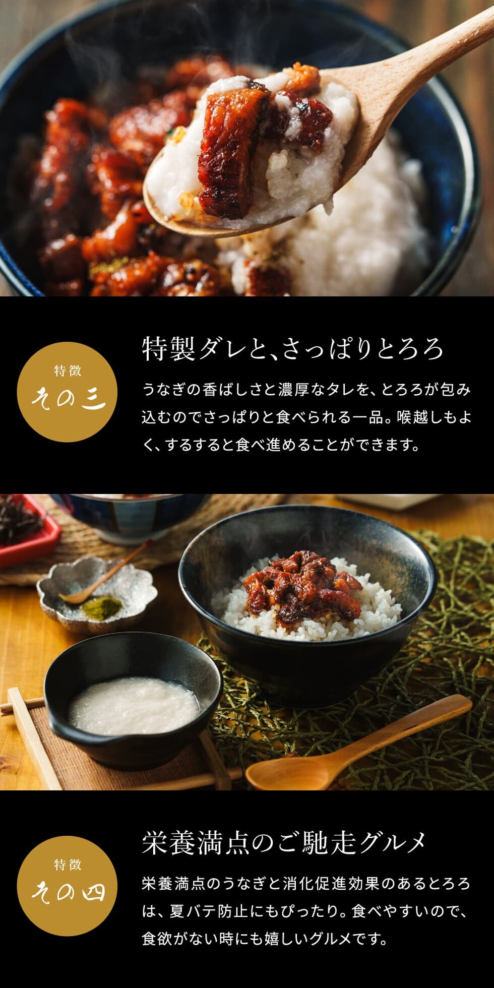 ●原材料:[うなぎ蒲焼]うなぎ(国産)、しょうゆ、ぶどう糖果糖液糖、発酵調味料、みりん、砂糖、水あめ/着色料(カラメル、アナトー)、増粘剤(加工澱粉、増粘多糖類)、調味料(アミノ酸等)、(一部に小麦・大豆を含む)[とろろ]長芋、(一部にやまいもを含む)[たれ]しょうゆ(国内製造)、みりん、砂糖、清酒/酒精、(一部に小麦・大豆を含む)[山椒]さんしょう(国産)
