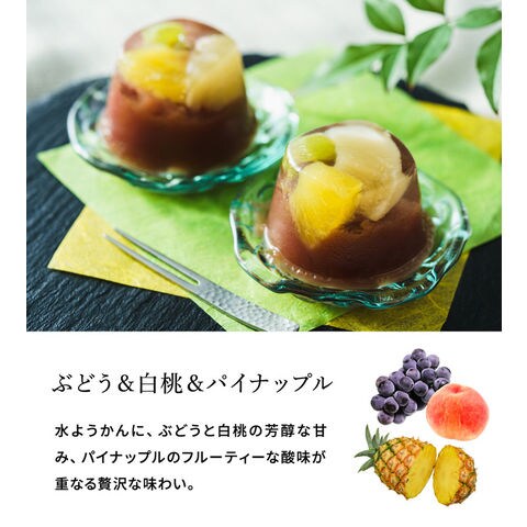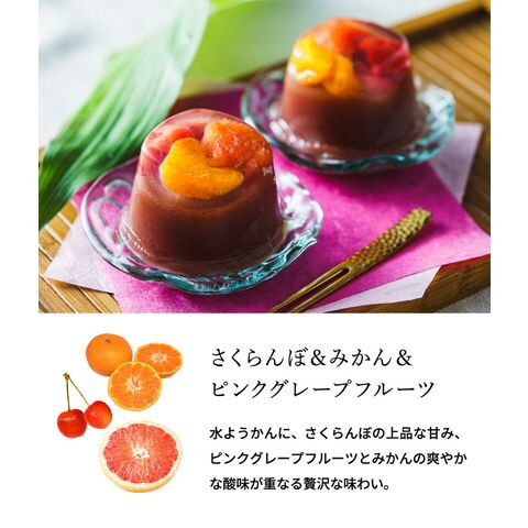 北海道産のしゅまり小豆と十勝小豆をブレンドした、なめらかな水ようかんに、3種の果実を合わせました。
