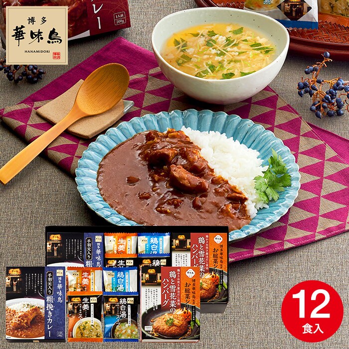●内容:博多華味鳥 手羽元入り粗挽きカレー(180g)、お総菜 鶏と雪花菜のハンバーグ、生姜スープ、鶏白湯スープ、生姜雑炊の素、鶏白湯雑炊の素×各2
