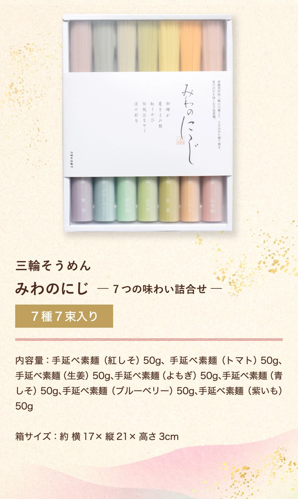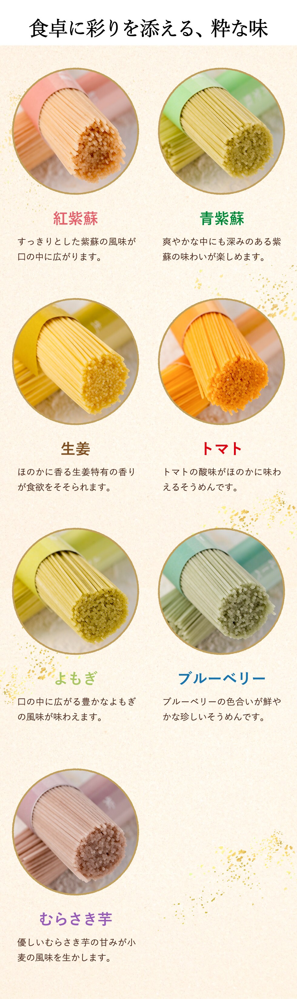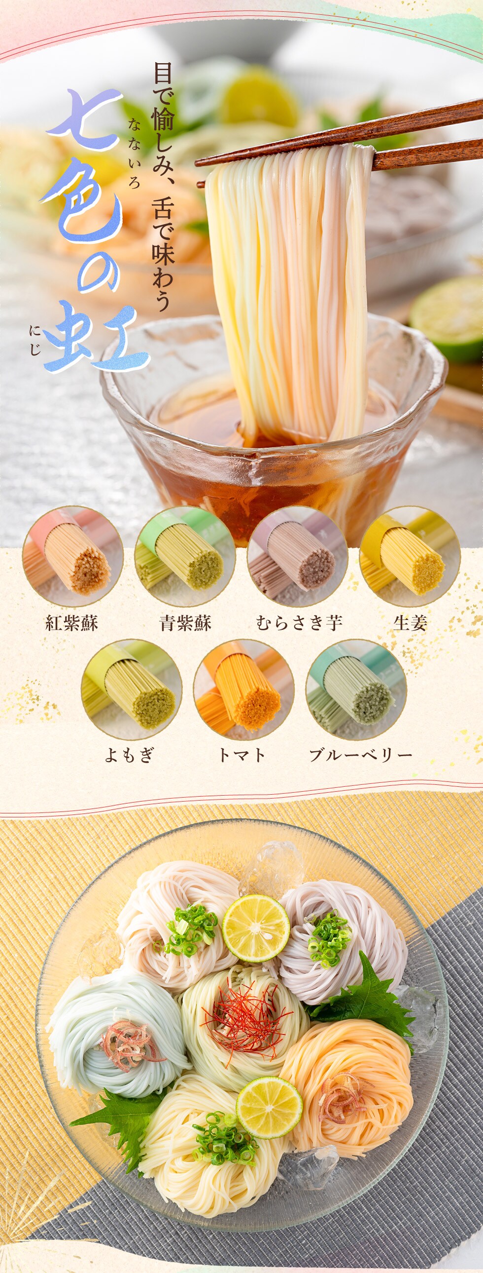 ●内容量 :手延べ素麺(紅しそ) 50g、手延べ素麺(トマト) 50g、手延べ素麺(生姜) 50g、手延べ素麺(よもぎ) 50g、手延べ素麺(青しそ) 50g、手延べ素麺(ブルーベリー) 50g、手延べ素麺(紫いも) 50g