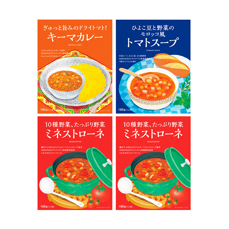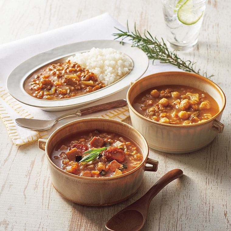 ●セット内容:キーマカレー・モロッコ風トマトスープ 各160g×1袋、ミネストローネ160g×2袋