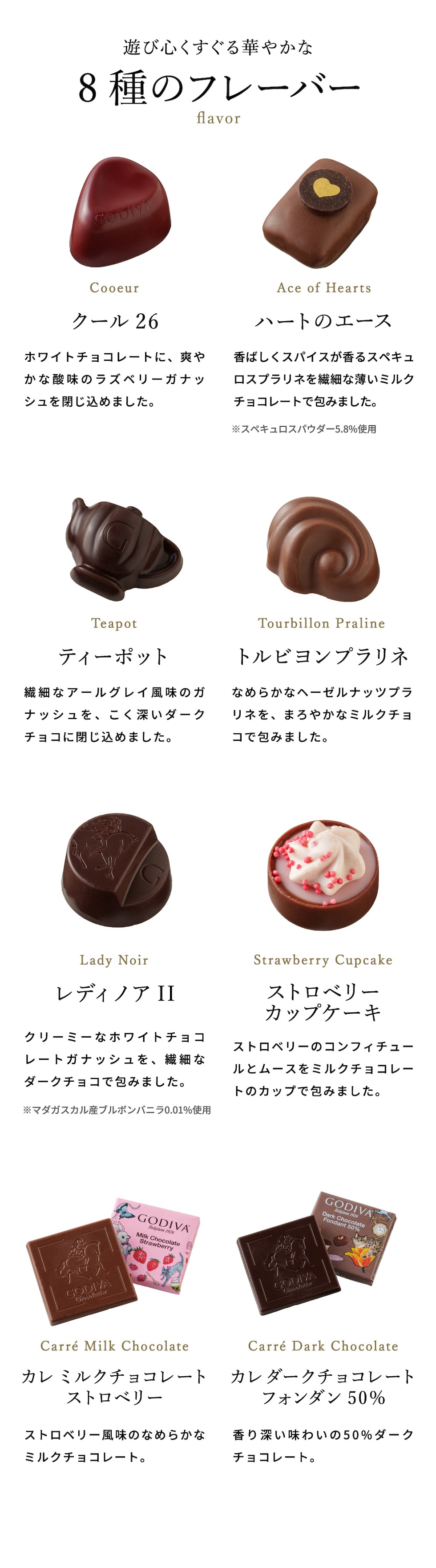 ●原材料:砂糖、カカオマス、全粉乳、ココアバター、キャラメルソース、ヘーゼルナッツ、ストロベリーパウダー、植物油脂、ラズベリー果汁、異性化液糖、ストロベリー果汁、アーモンド、加糖練乳、バター、脱脂粉乳、バターオイル、小麦粉、紅茶、ラズベリーパウダー、転化糖、乳等を主要原料とする食品、シナモン、でん粉、砂糖加工品、マカダミアナッツ、食塩、ピーカンナッツ、バニラパウダー、米粉、はちみつ、クリーム/グリセリン、ソルビトール、乳化剤、香料、着色料(赤40、アカビートジュース、金箔、コチニール、ウコン)、酸味料、光沢剤、(一部に小麦・乳成分・アーモンド・大豆・マカダミアナッツを含む)