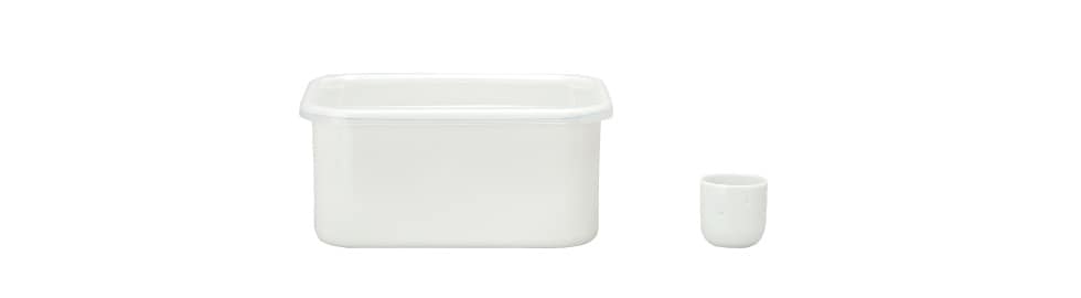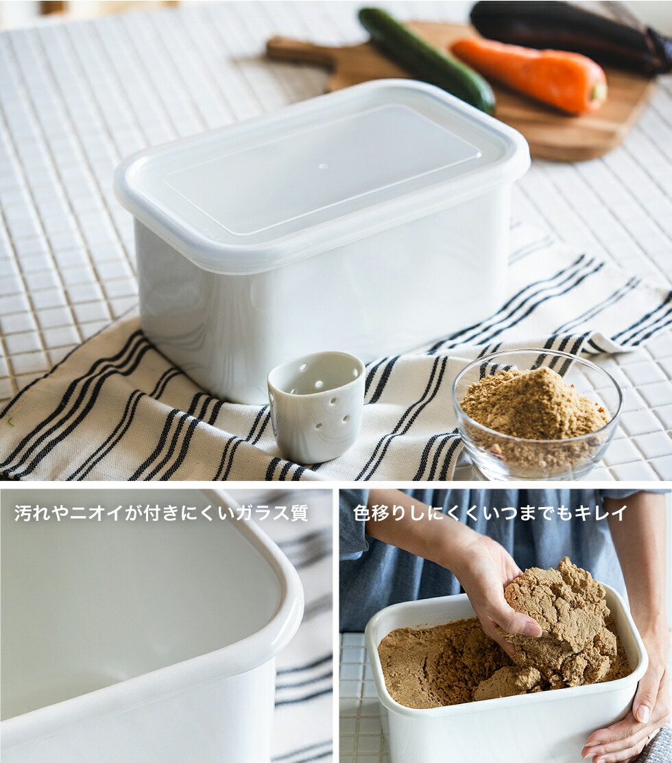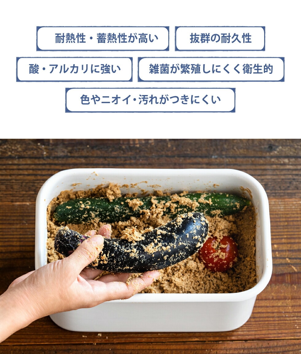乾燥ぬか1kgで作るぬか床用の保存容器です。ニオイや汚れが付きにくく、お手入れしやすい琺瑯(ホーロー)製。冷蔵庫で保管することを想定し、角形で高さ12cmに設定されています。温度が一定の冷蔵庫でぬか床を育てれば、発酵もゆるやかで数日に1回のかき混ぜでOK。1年中安定したぬか漬けが楽しめます。