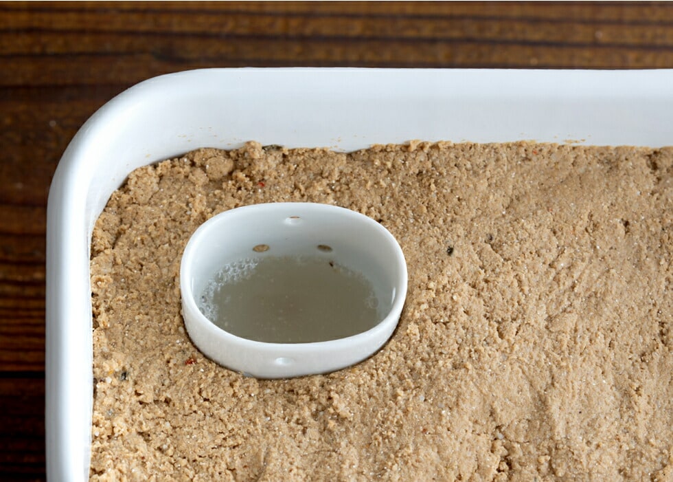 野菜など食材を漬けているうちに、ぬか床が水っぽくなってきたら付属の水取器で水分調整が簡単にできます。まず水取器の穴がぬかに埋まるところまで差し込み、余分な水分が溜まったら水を捨てます。水取器も磁器製で衛生的に保てます。