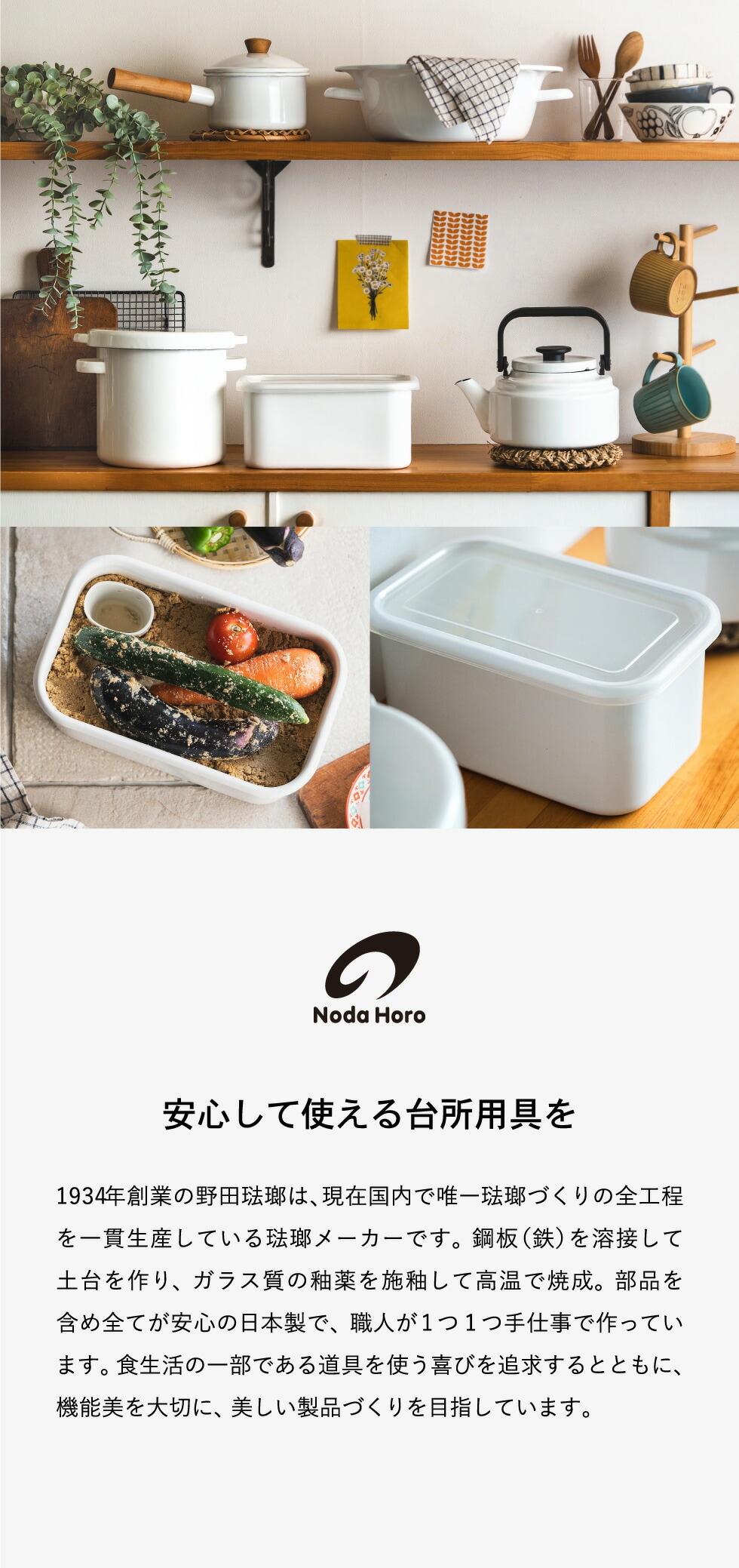 ホーローは鉄の表面にガラスの釉薬をコーティングし焼き付けている為、蓄熱性が高く一度冷えると温度変化しにくい性質があります。ガラスは汚れやニオイが付きにくく雑菌が繁殖しにくい素材。色移りもしにくいので、いつまでもキレイです。