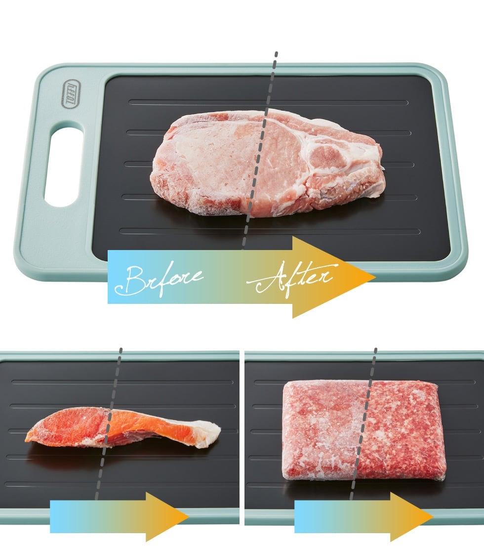 分厚い牛ステーキや魚の切り身をはじめ、ラップに包まれた冷凍ミンチもムラなく解凍できます。常温の室内で、食材をできるだけ平らな状態にしてプレートに置くのがスムーズに解凍を進めるポイントです。
