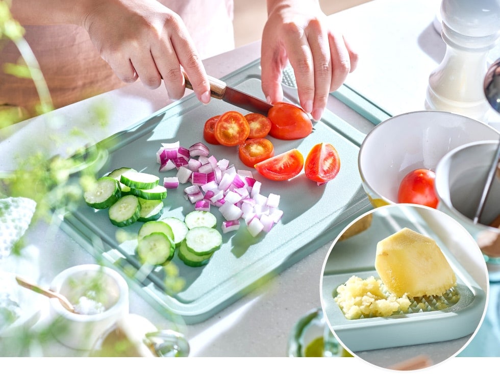 まな板(カッティングボード)は抗菌仕様なので、いつでも清潔に使用できます。またショウガやニンニクを簡単にすりおろすことができる薬味おろし付き。衛生面の仕様に加えて、あれば嬉しい調理の幅を広げてくれる設計です。
