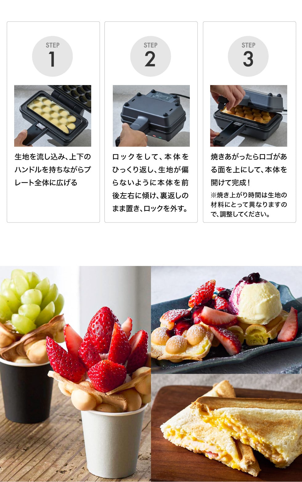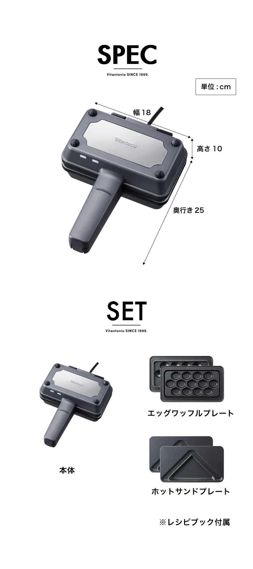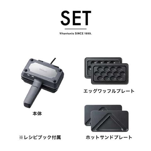 ●セット内容:本体、エッグワッフルプレート、ホットサンドプレート、取扱説明書、レシピブック