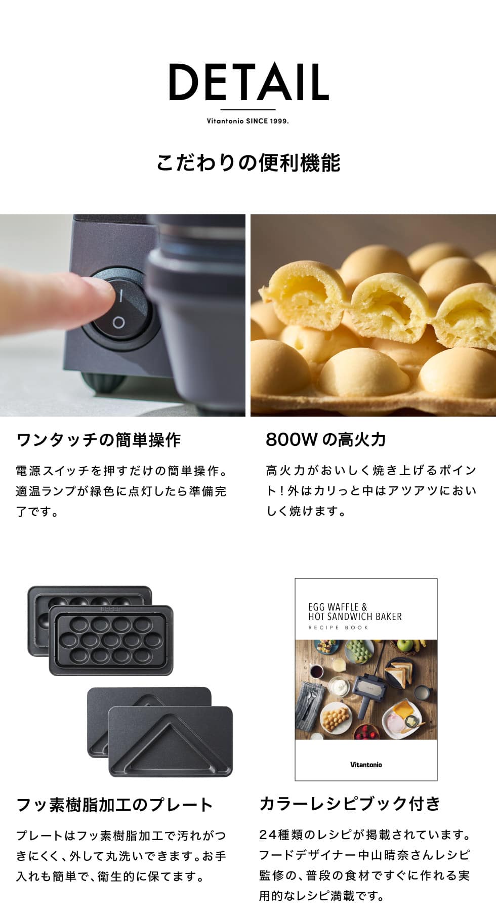 本格エッグワッフル&ホットサンドが作れるベーカーです。800Wの高火力でおいしく焼き上げます。香港発祥スイーツ、エッグワッフルの外はカリッと中はもちもちの食感を再現!ホットサンドは食パン1枚で作れる食べきりサイズで、朝食にもおすすめです。レシピ付きで初心者も安心、トッピングやアレンジも楽しめます。
