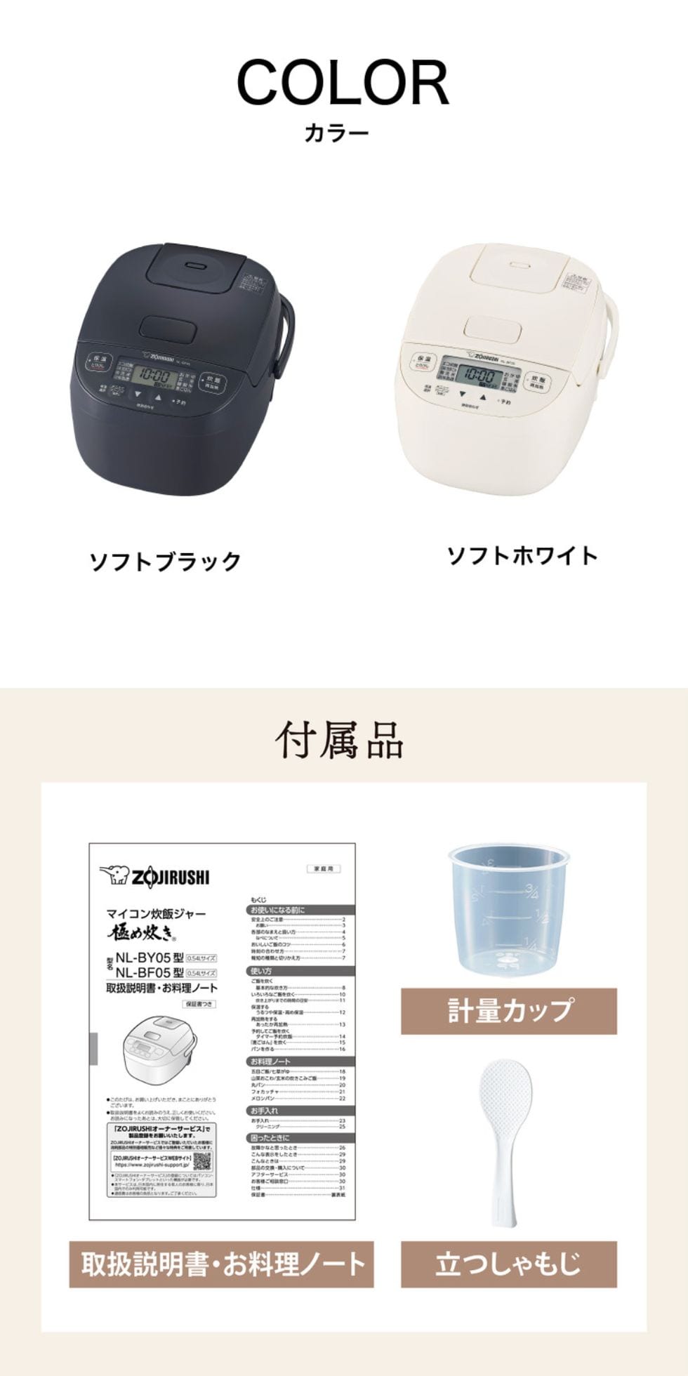 象印 炊飯器 小容量マイコン炊飯ジャー 3合炊き 極め炊き NL-BF05 / マイコン炊飯器 白米 無洗米 玄米 雑穀米 麦ごはん 保温 厚釜 ZOJIRUSHI ブラック ホワイト 黒 白 キッチン家電 調理家電 一人暮らし 新生活 JGS 送料無料 / ソフトホワイト
