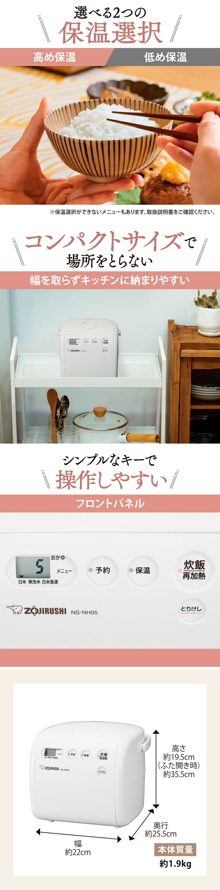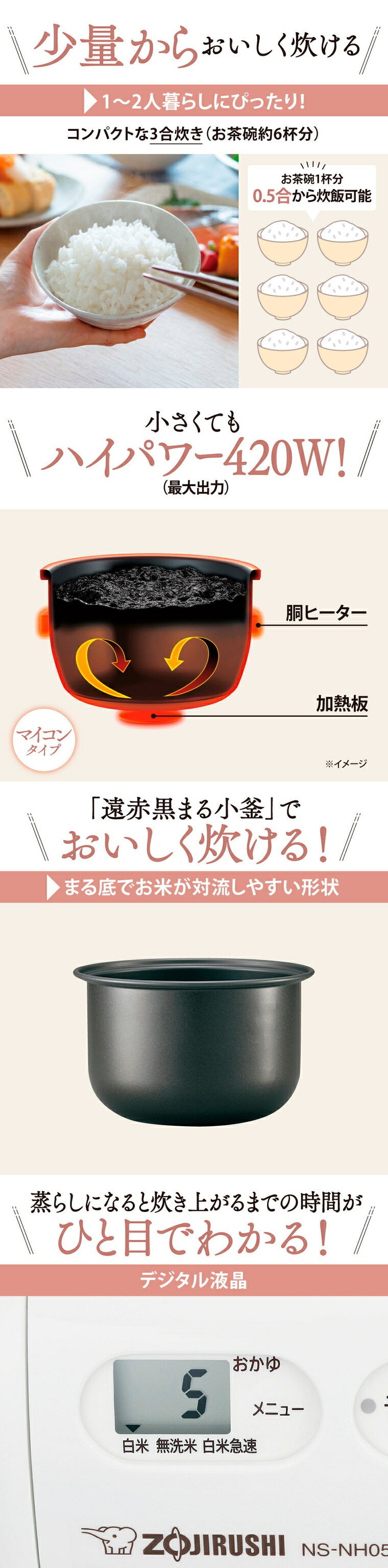 象印 炊飯器 小容量マイコン炊飯ジャー 3合炊き NS-NH05 / マイコン炊飯器 小型 白米 無洗米 保温 おかゆ ZOJIRUSHI ホワイト 白 キッチン家電 調理家電 一人暮らし 新生活 シンプル コンパクト JGS 送料無料